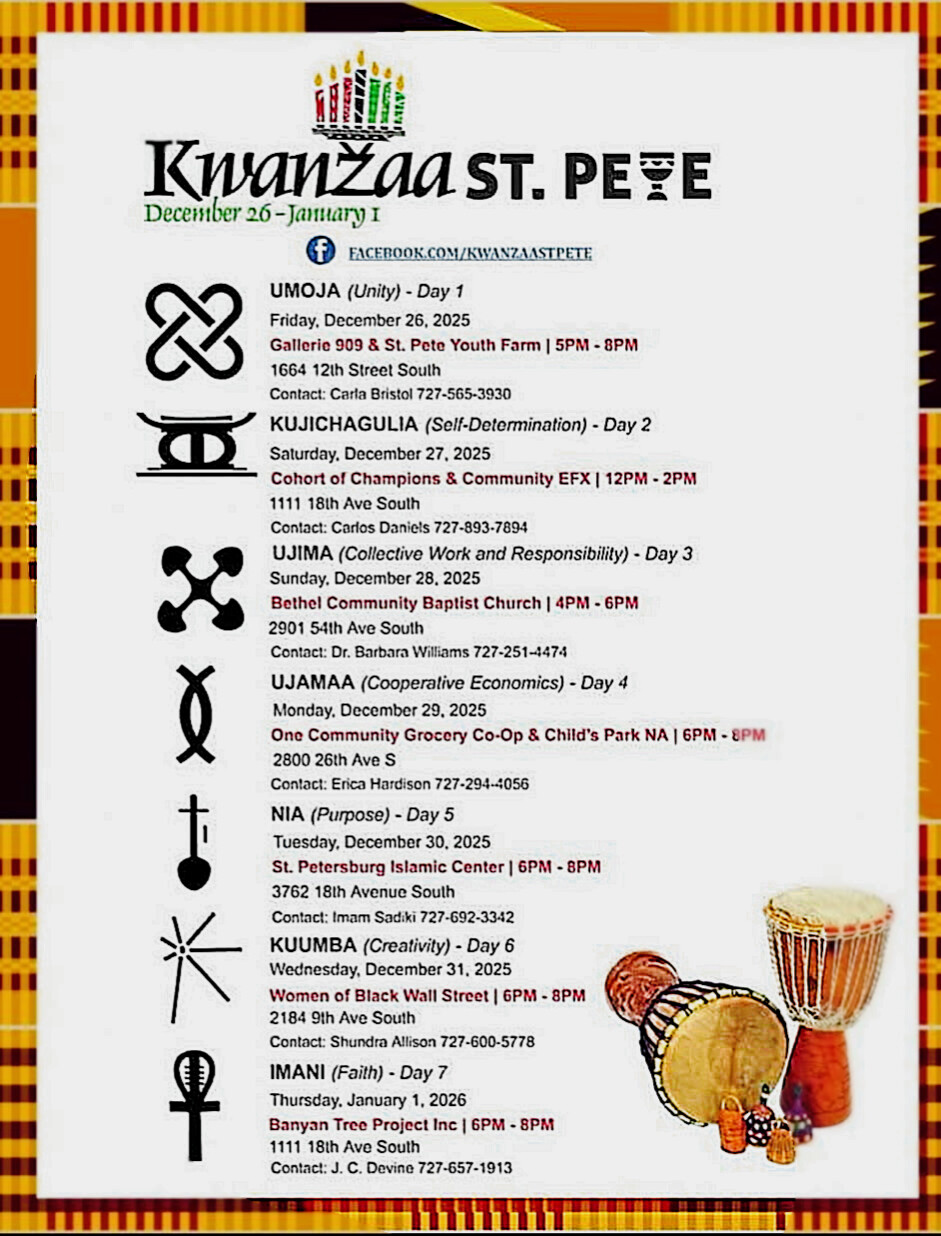 St. Petersburg, FL — On Monday, December 29, 2025, community members are invited to gather for a Kwanzaa Day 4 (Ujamaa – Cooperative Economics) Celebration from 6:00–8:00 PM at McCabe United Methodist Church, located at 2800 26th Ave S, St. Petersburg, FL 33712.