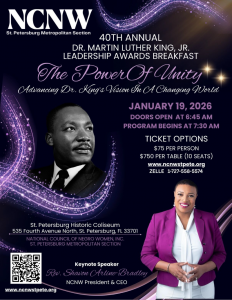 Continuing its long-standing commitment to civic leadership, The Woodson will support its affiliate organization, the St. Petersburg Metropolitan Section of the National Council of Negro Women (NCNW), by hosting the 40th Annual Dr. Martin Luther King, Jr. Leadership Awards Breakfast. The event will take place on Monday, January 19, at the St. Petersburg Coliseum and will honor individuals whose leadership and service embody Dr. King’s enduring legacy.